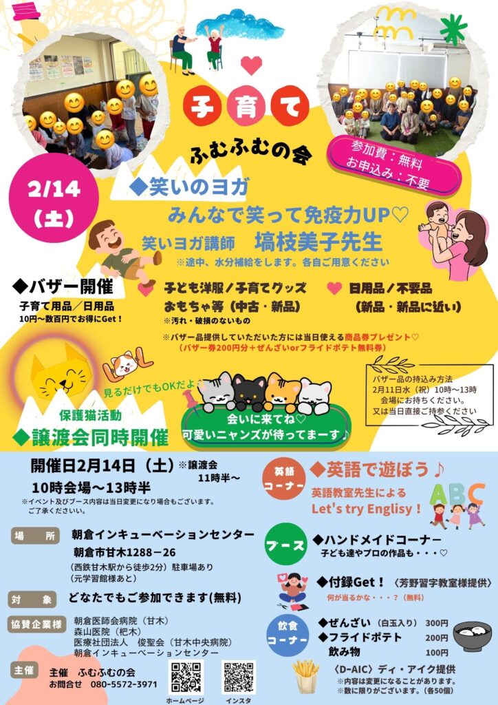 本年度最後のセミナー&イベントです。どなたでも参加できますので是非お越しください。お申込みは必要ありません。 当日お会い出来るの楽しみにしています。(^o^) Category: 未分類By cocoro-staff2026年1月17日 Author: cocoro-staff Post navigationPreviousPrevious post:第33回ふむふむの会 子育ての集いが1月に開催されます。Related Posts第33回ふむふむの会 子育ての集いが1月に開催されます。2025年12月24日第31回ふむふむの会が朝倉市で開催されました。2025年11月22日第30回ふむふむの会 「子育ての集い」が開催されます。2025年9月7日第29回ふむふむの会「子育ての集い」が開催されます2025年8月25日第28回ふむふむの会「朝倉会場」で「食物がウンチになるまで」が開催されました。2025年8月10日第28回ふむふむの会が8月9日(土)に朝倉で開催されます2025年7月26日